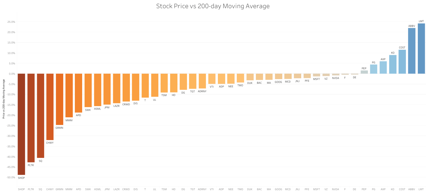 Click on the image to open it on Tableau Public, where it will be a lot more interactive and up-to-date (unfortunately, WordPress does not allow me to embed the interactive “viz” directly on this page). From left-to-right, this figure shows the stocks that a trading the cheapest relative to their 200-day moving average price (200dMA). The more negative this percentage is, the more these stocks have fallen from their recent highs (perhaps oversold?). Stocks with a strongly positive percentage, however, are showing positive momentum and are in a general uptrend (or perhaps overbought?). These are useful data points to have, in case you want to deploy new funds to the portfolio or rebalance your current holdings.