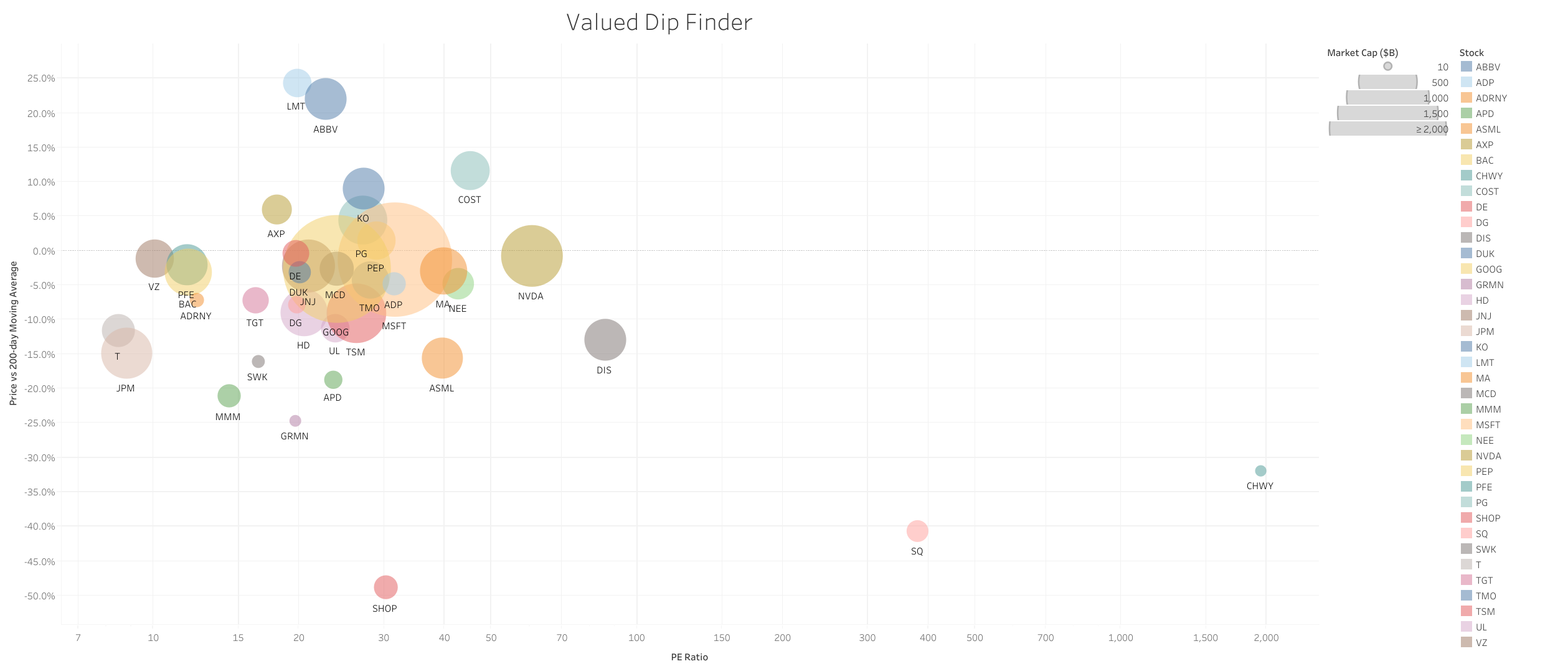 Here is another version of this information (on the y-axis), but now I have added two more dimensions to the visualization: the “price-to-earnings ratio” (or PE ratio, on the x-axis) and the market capitalization of the company in billions of dollars (size of the bubbles). These give some more insight into how risky a certain stock is. For example, stocks at the bottom of the chart might have fallen the most from their 200dMA, but if they are also on the right side of this chart (high PE ratio) they might still be strongly overvalued. Maybe the stocks at the bottom left of the cloud are a much safer bargain.